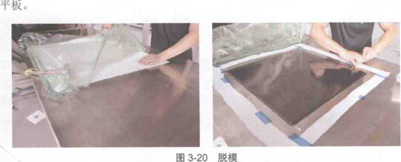 在零件脫模(圖3-20)過程中,可以使用楔形脫模工具輔助脫模,注意工具應采用木質或塑料,禁止使用金屬工具,它可能對零件或工裝帶來損傷。在脫模操作中,要特別小心,不要損傷零件或工裝。如圖3.21所示為熱壓罐固化后的復合材料。