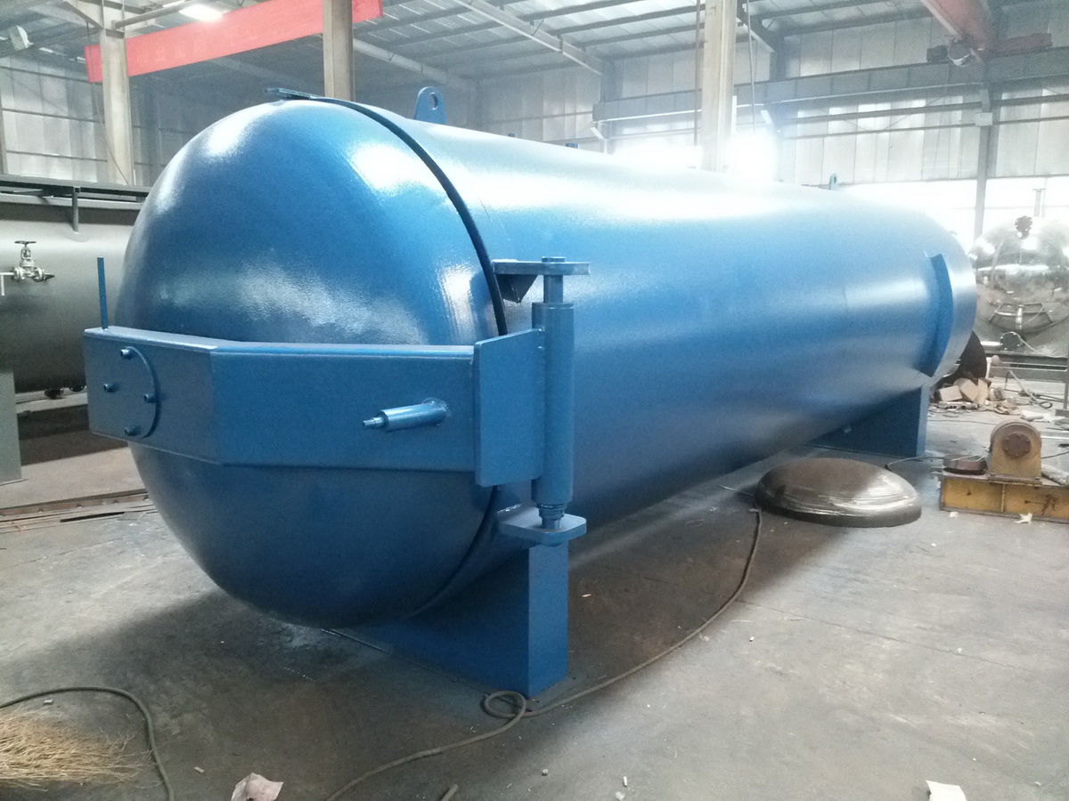 主要工作原理:采用幾組特制的不銹鋼散熱管分布在罐壁控制加熱。蒸汽由罐后2組自動閥門進入到罐內的散熱片中,散熱管按規則排列在罐體的上下左右方,高溫風機通過溫度循環板將熱量由后至前均勻分散,熱量推進至罐門后返回風機導流罩處,循環風道促使罐內熱量更均勻的循環和擴散,優化熱循環和熱傳導效率,熱量在罐內來回循環,形成均勻的溫度場,溫度均勻無死角,壓力恒定。解決了罐內產品因溫度和壓力不均勻,而造成產品質量的差異,設定工作程序后,控制系統自動進行升溫、保溫、硫化等工作,硫化結束后自動斷電并發出聲光報警音提示。采用這兩種加熱方式,都需要額外配備鍋爐,產生蒸汽硫化。