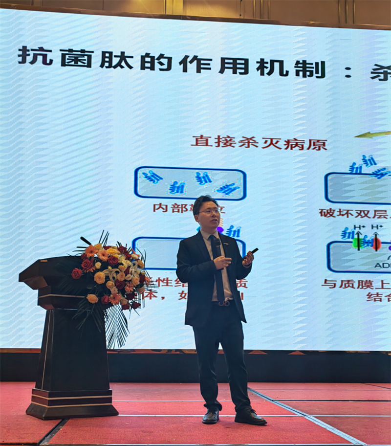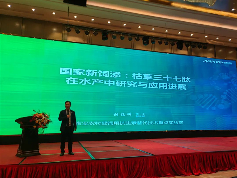 中農(nóng)穎泰集團副總經(jīng)理劉揚科博士出席會議,并做題為國家新飼添-枯草三十七肽的精彩報告,劉博士首先介紹了枯草三十七肽的研究歷程,及國家新飼添的申報歷程,集團數(shù)十年專注于抗菌肽的艱苦研發(fā),終于獲得國家首個抗菌肽新飼添證書,開創(chuàng)了抗菌肽應(yīng)用研發(fā)新紀(jì)元!劉博士詳細闡述了抗菌肽的作用機制、現(xiàn)場應(yīng)用效果。在水產(chǎn)上,抗菌肽具有促進生長、修復(fù)腸道、提高免疫力增加成活率等作用,中農(nóng)穎泰抗菌肽水產(chǎn)飼料產(chǎn)品成分明確、安全合法可檢測、效果顯著廣泛使用。