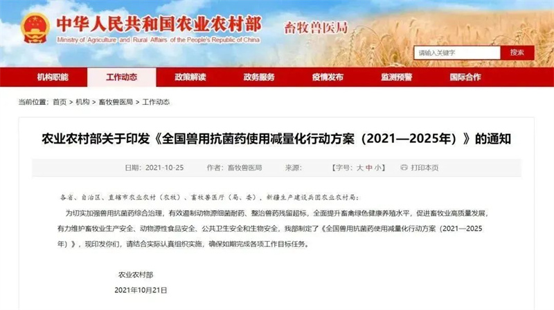 為了遏制微生物耐藥,自1986年開始,世界各國陸續在動物飼料和養殖生產中實行禁抗、減抗政策。我國農業農村部發布第194號公告:自2020年7月1日起,飼料生產企業停止生產含有促生長類藥物飼料添加劑(中藥類除外)的商品飼料。并于2021年制定了《全國獸用抗菌藥使用減量化行動方案(2021—2025年)》,行動方案指出:到2025年末,50%以上的規模養殖場實施養殖減抗。